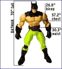 Other action figures with long-term popularity, like Batman, Luke Skywalker and Hans Solo, have also apparently been hitting the gym over the years, because they're all bulking up too. Some action figures like X-Men's Wolverine have physiques that far exceed the muscularity of even the largest competitive bodybuilders. A life-size Wolverine would have 62″ chest and 32′ biceps!